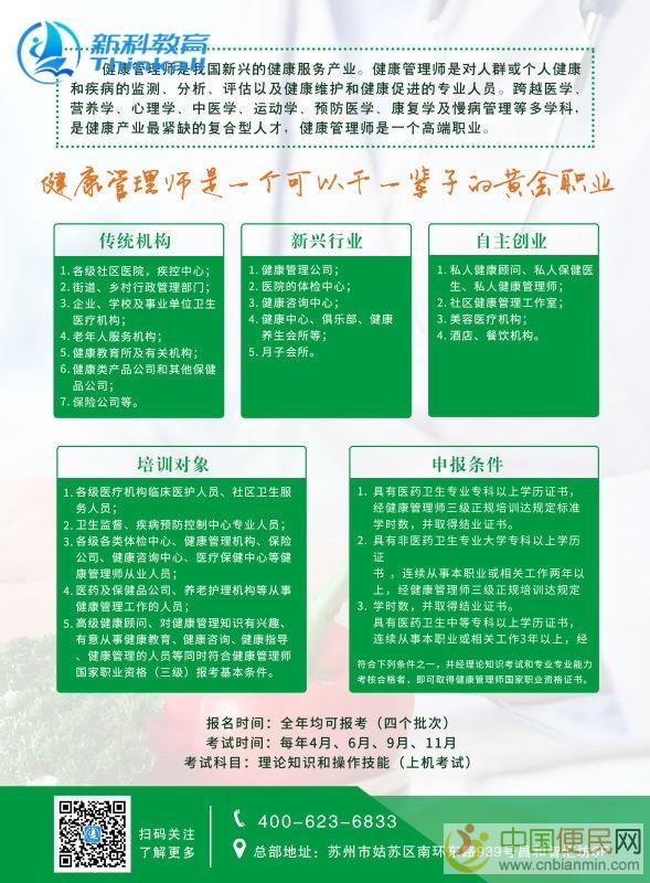 有志于在健康体检、.服务、健康保险、*保健、健康养老以及体育健身、.旅游、美容养生、母婴服务、保健食品、营养等行业从事健康教育、健康咨询、健康管理及相关的各界人士ERDZ。招生专业共分健康管理师、高级健康管理师两个级别。健康管理师要求大专以上学历,或从事健康及相关工作3年以上;高级健康管理师要求具有健康相关专业本科学历,或大专学历及从事健康相关工作5年以上,并取得健康管理师证书者。医学、营养、心理等健康领域特殊贡献者,在级别申报时可适当放宽,不同级别的学员需参加相应级别的考试ERDZ。